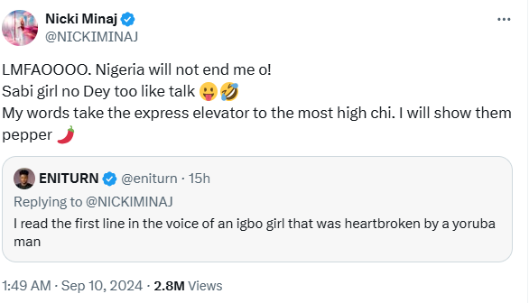 In response to the observations, Nicki Minaj joked that "Nigeria won't kill her" while quoting the popular line from Ayra Starr's 'Comma' "Sabi Girl no dey too like talk" in an expression of her Nigerian side.