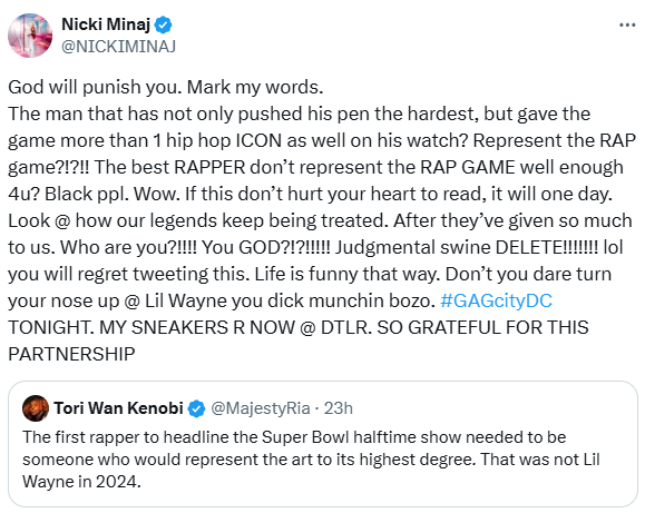 On September 10, 2024, Nicki Minaj on X shared her thoughts on the National Football League's decision to choose Kendrick Lamar as the headliner of the 2025 Super Bowl Halftime Show scheduled for New Orleans.