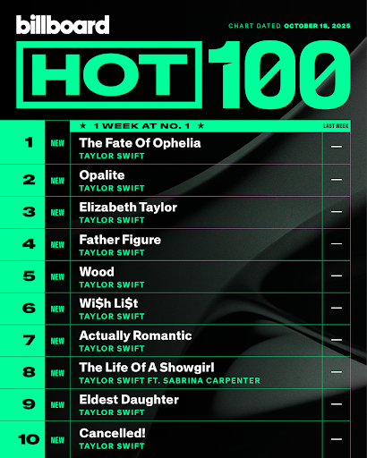 Taylor climbed and cleared the board. Her new album, The Life of a Showgirl, made Billboard history this week, with all 12 songs from the album securing the top 12 spots on the Hot 100. It’s a full sweep that’s never been done before. Leading the charge is ‘The Fate of Ophelia’, which debuts at No. 1.