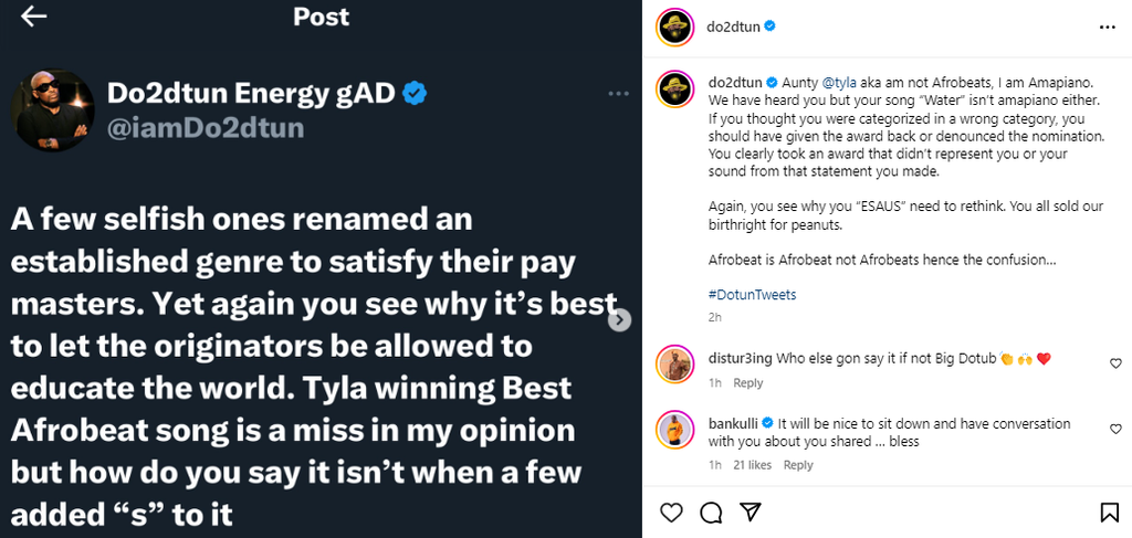 "Aunty @tyla aka am not Afrobeats, I am Amapiano. We have heard you but your song “Water” isn’t amapiano either. If you thought you were categorized in the wrong category, you should have given the award back or denounced the nomination. You clearly took an award that didn’t represent you or your sound from that statement you made," Do2tun said on his Instagram account.