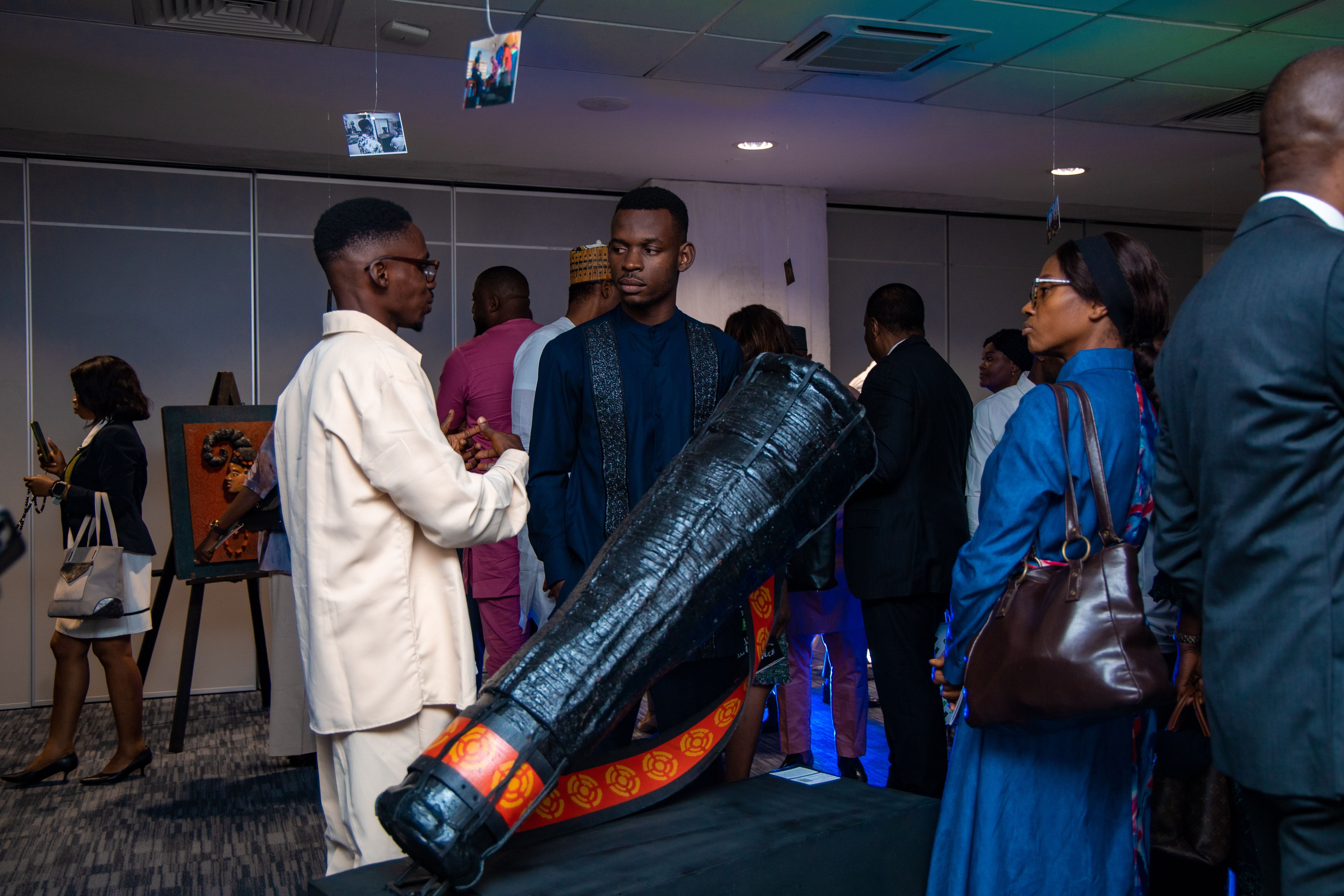 Among the striking pieces on display was Gift Akwajie's "The Children Have Gone Mad" — a mixed-media sculpture inspired by traditional Nok, Gelede, and Tiv masks. The work explores unity and cultural memory in the face of modern tribalism and environmental damage. Adesanya Emmanuel's "Ori Olokun" honored the Yoruba deity of the ocean, symbolizing life, death, rebirth, and resilience through recycled tyre materials.
