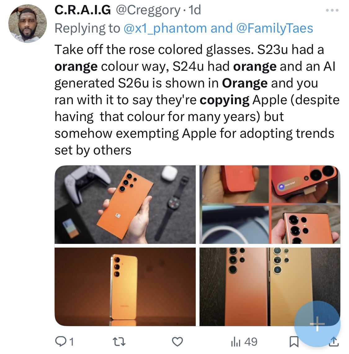 On this one, Samsung hasn’t exactly copied Apple’s cosmic orange color because Samsung has always had an orange color. The Samsung Galaxy S23 Ultra and S24 also an orange color variant. So the rumour on copying may just be something to stir controversy.