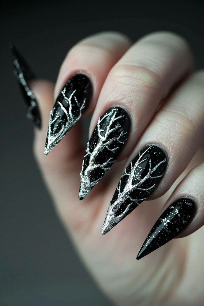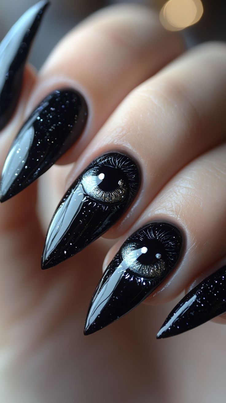 If you want to stray from girly designs and go for a dark and dramatic effect, Gothic nails offer that spooky Halloween feel. Black polish, silver accents, and designs like crosses or lace can give your nails a vintage, spooky appeal. It’s a timeless look that works for any Halloween costume or theme your nails into miniature horror scene.