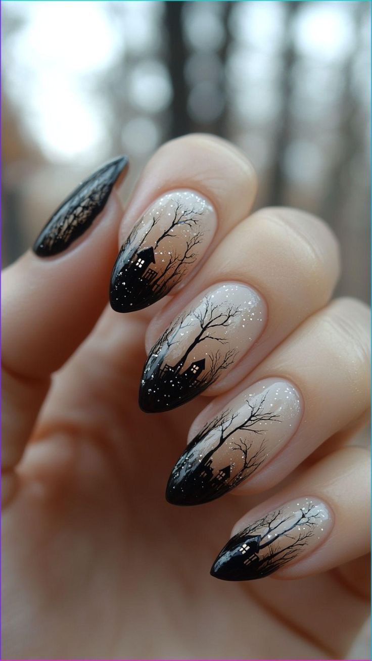 For a sophisticated, storytelling nail design, haunted house-themed nails are the way to go. Tiny details like creepy trees, moonlit skies, and silhouettes of haunted mansions can turn your nails into miniature horror scenes.