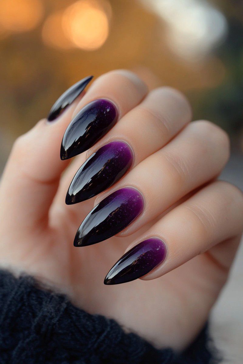 For the girls that still want to maintain their clean girl, minimalist look with something sleek, midnight ombré nails in an almond shape are a sophisticated choice. Fading from deep purple to black, this ombré effect mimics the mysterious beauty of a midnight sky. The almond shape adds a touch of elegance, making it perfect for channeling vampire queen vibes or a dark sorceress.