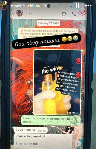 A message dated February 17, 2025, revealed that he had inquired about purchasing a bottle of penis enlargement oil, which was priced at N15,000.