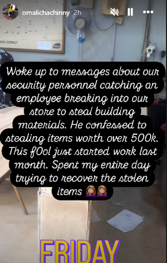 According to Chinny, security personnel caught the employee red-handed while attempting to break into the company’s storage facility to steal building materials.