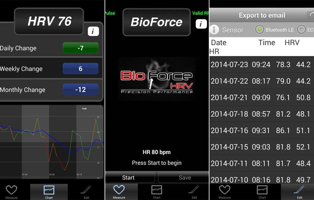BioForce HRV Your heart rate variabilitya.k.a., the fluctuations in the amount of time between each heartbeatis a marker of your bodys current stress levels and exercise recovery status. Too much fluctuation is a sign of fatigue , and BioForce HRV uses these measurements to determine how hard you should work out. I've used this for years, says Mens Health Nutrition Advisor Mike Roussell, Ph.D. It allows me to know how long and hard I should train that day based on the state of my nervous system. (free for iOS and Android, though use requires purchase of $194 BioForce HRV sensor, itunes.com and play.google.com ) BioForce HRV
