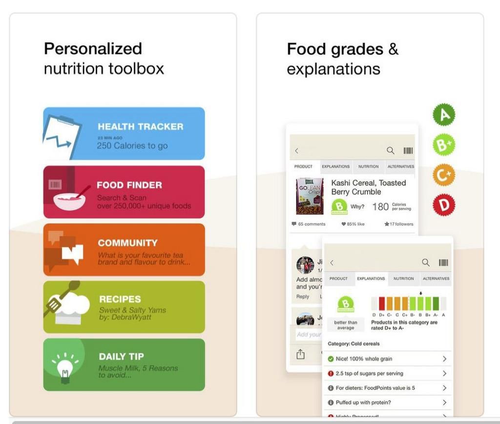 Fooducate Many foods, such as protein bars or frozen dinners, masquerade as healthy options , even though they're actually anything but. Fooducate makes it easy to determine whether those quinoa crackers are actually healthier than a bag of chips. Its database of more than 250,000 items allows you to scan any food UPC label using your smartphones camera. It'll then give the product a letter grade, along with an explanation for why it is or isnt healthy. The app will even provide a list of healthier options that are similar to the product youre eyeing. (free for iOS and Android, itunes.com and play.google.com ) Fooducate/iTunes