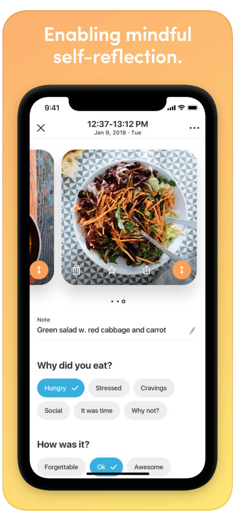YouAte Think of this app as a mashup of traditional food diaries, like MyFitnessPal, and instagram. Instead of weighing and logging food from the database, users upload photos of meals. YouAte stresses mindful eating, so you can record emotions to determine if stress led you to eating those afternoon donuts. (free basic version for iOS and Android, itunes.com and play.google.com ) iTunes.com