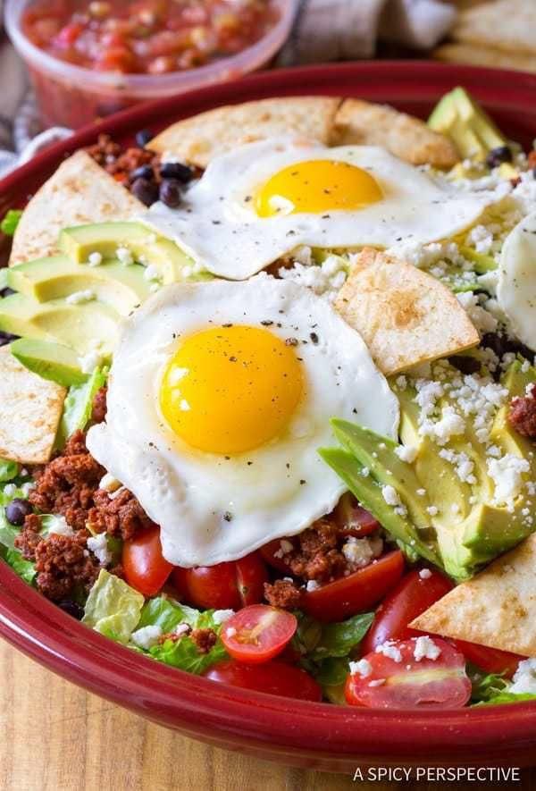 Mexican Breakfast Salad When it comes to breakfast salads, anything goes, including chorizo sausage, black beans , avocado, and crumbled queso. Perfect for all those days you know you wont have time for a proper lunch. Get the recipe Per serving: 726 calories, 49 g fat (17 g saturated), 37 g carbs, 1,721 mg sodium, 6 g sugar, 12 g fiber, 37 g protein A Spicy Perspective