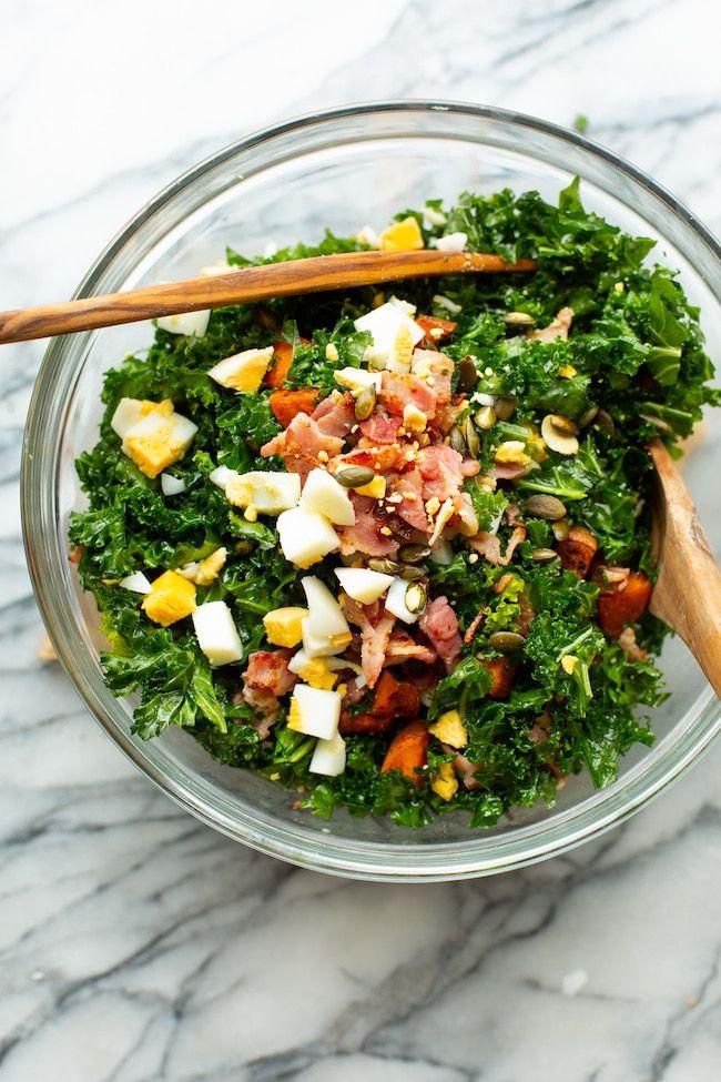 Sweet Potato Kale Breakfast Salad Pan-fried bacon is totally allowednay, encouragedwhen its paired with kale, sweet potato, and pumpkin seeds. Get the recipe Per serving: 495 calories, 41 g fat (10 g saturated), 14 g carbs, 613 mg sodium, 1 g sugar, 6 g fiber, 17 g protein A Saucy Kitchen
