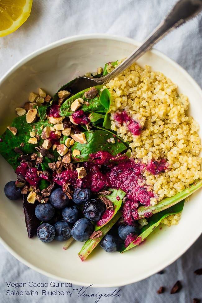 Superfood Quinoa Salad With Blueberries And Cocoa Nibs Word to the wise: If the toppings belong on your standard bowl of oatmeal, theyll taste delish piled high on spring mix, almonds and berries, too. Get the recipe Per serving: 359 calories, 17 g fat (3 g saturated), 46 g carbs, 366 mg sodium, 15 g sugar, 10 g fiber, 11 g protein Food Faith Fitness