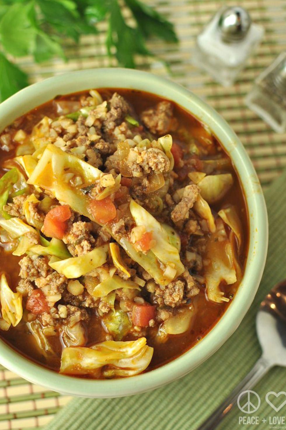 Paleo Keto Cabbage Roll Soup Never had a cabbage roll? You dont know what youre missing. Get the recipe from Peace, Love and Low Carb . Per serving: 265 calories, 15 g fat, 7 g carbs (net), 19 g protein. Peace, Love, and Low Carb