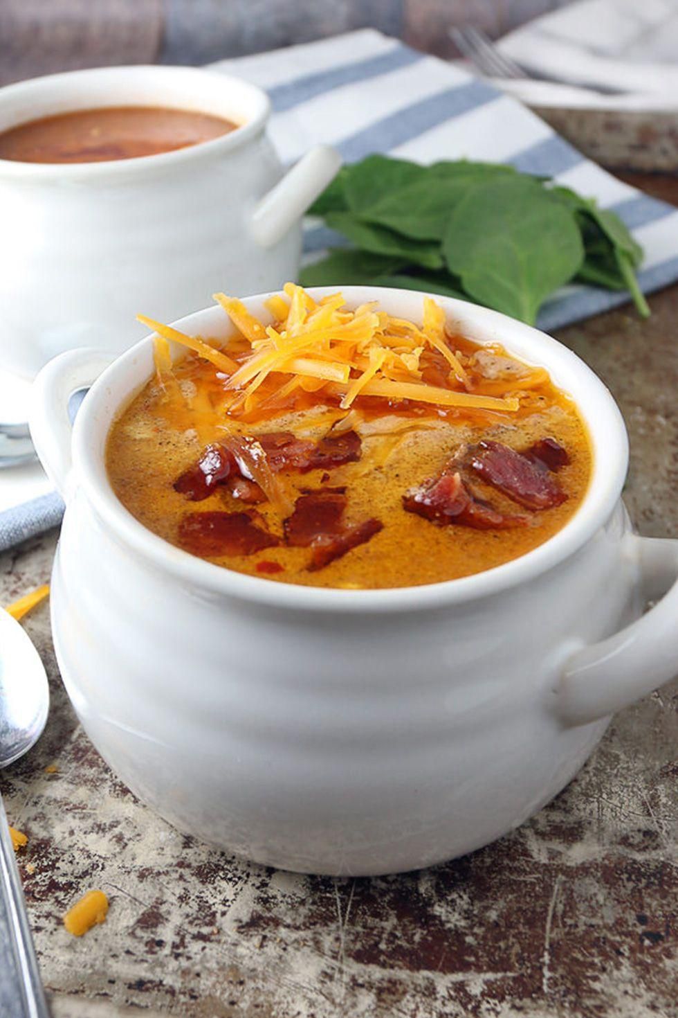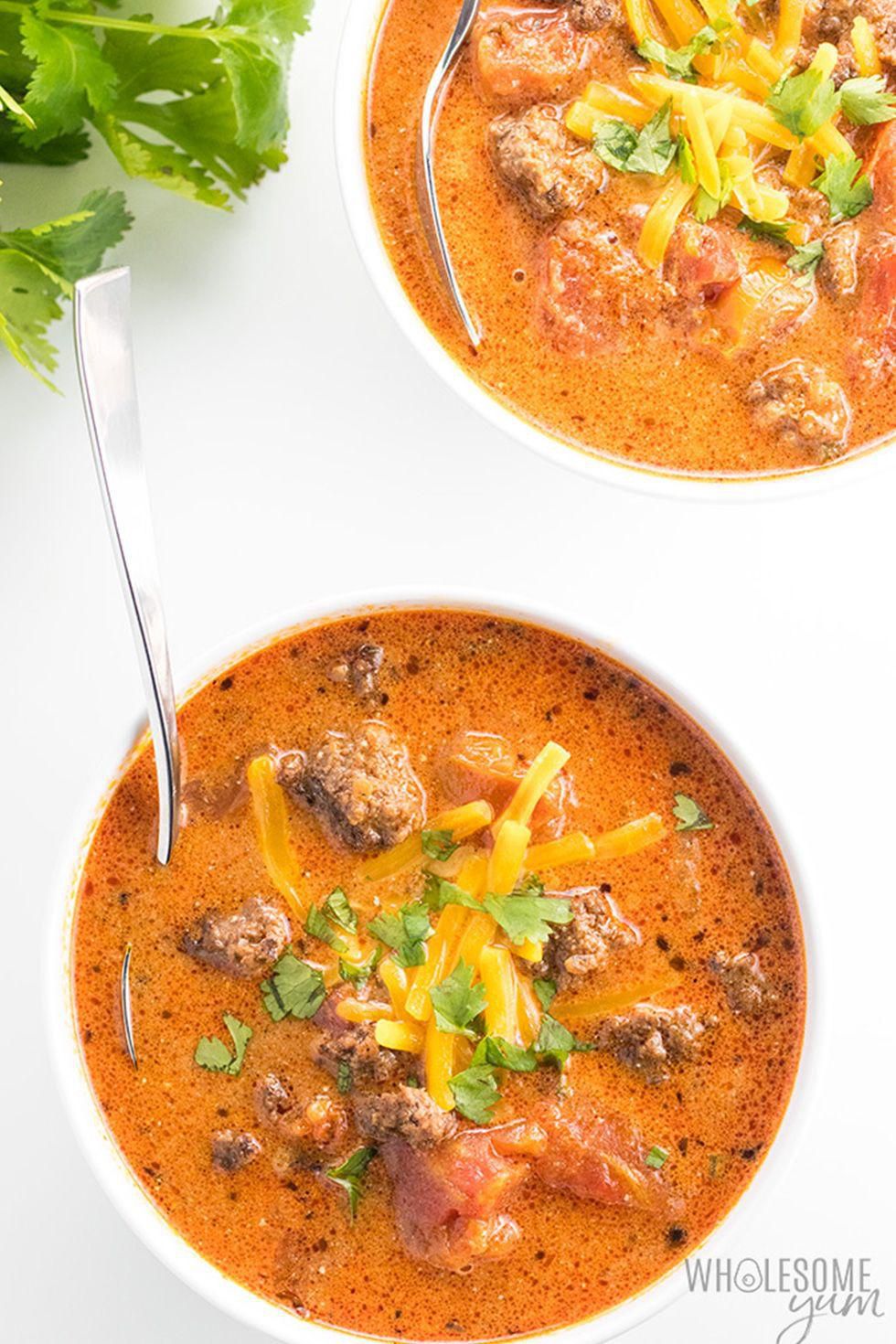 Bacon Cheeseburger Soup Bacon, ground beef, cheese, and a whole lot of spices make this a soup bursting with flavor. Theres even a dill pickle in there. Get the recipe from Ruled.Me . Per serving: 572 calories, 49 g fat, 4 g carbs, 3 g fiber, 23 g protein. Ruled.Me