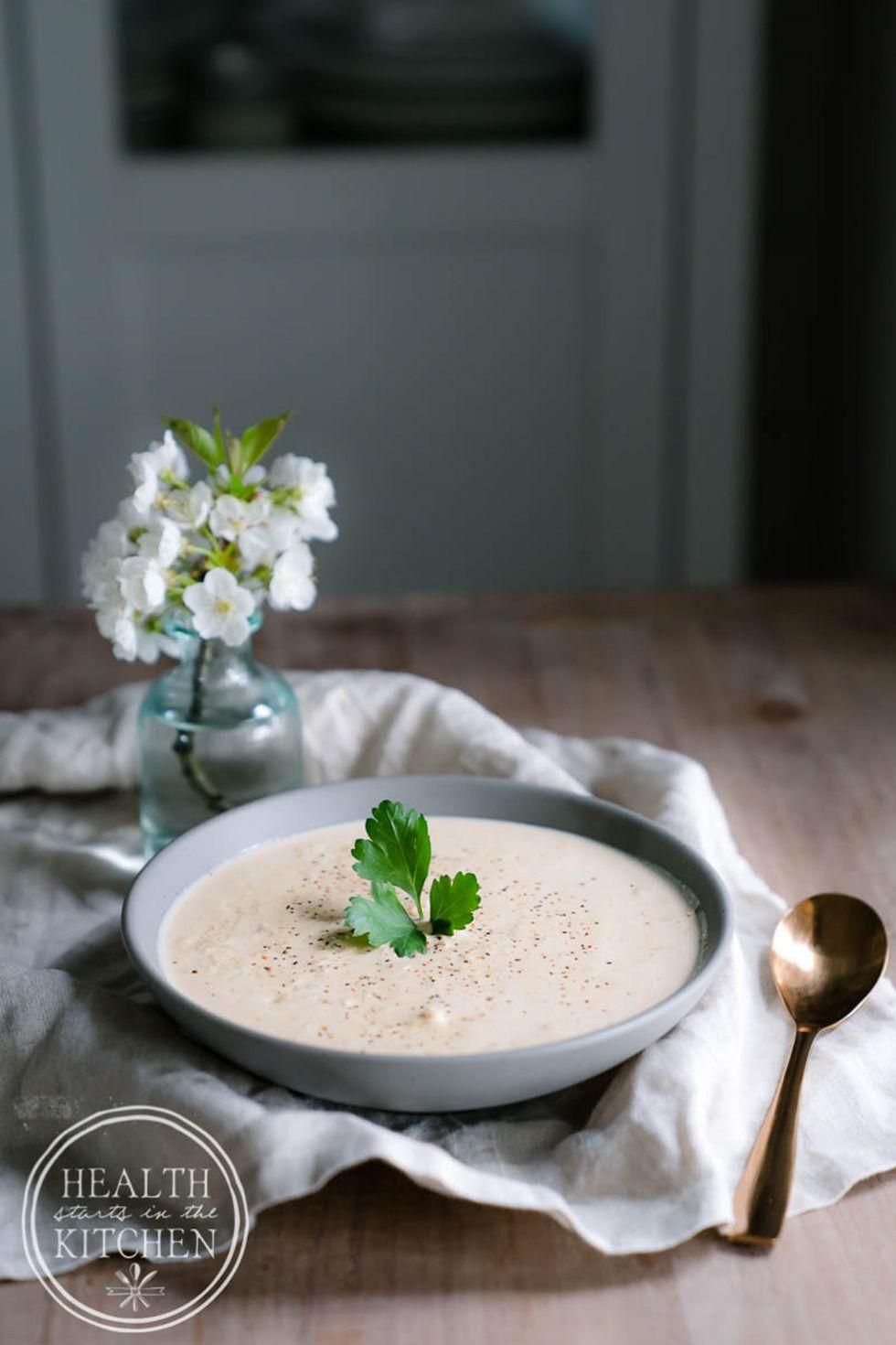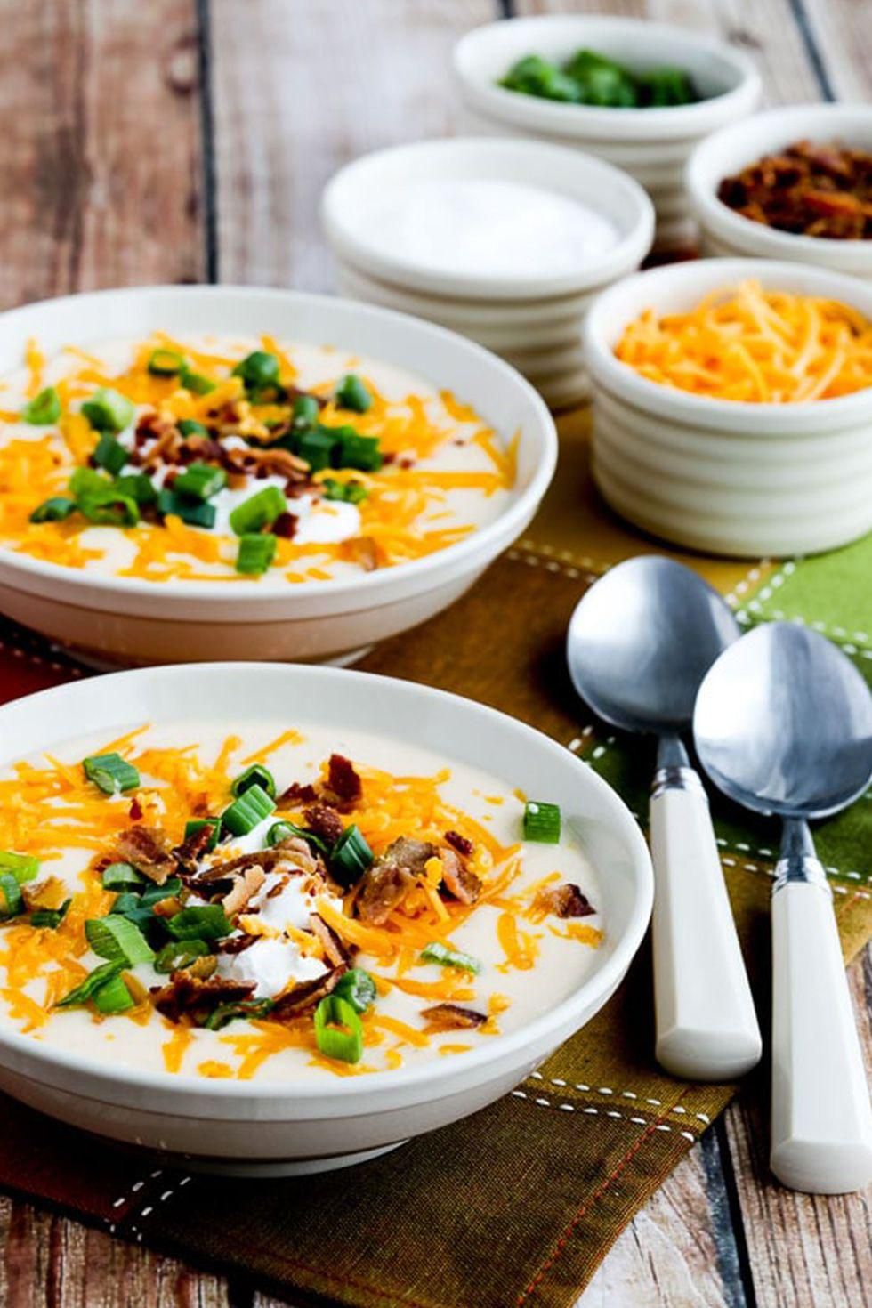 Loaded Cauliflower Soup Like loaded potato soup except with cauliflowerketos bvf (best veggie friend). Get the recipe from Kalyns Kitchen . Per serving: 323 calories, 26 g fat (16 g saturated), 13 g carbs, 6 g sugar, 1508 mg sodium, 5 g fiber, 14 g protein. Kalyn's Kitchen