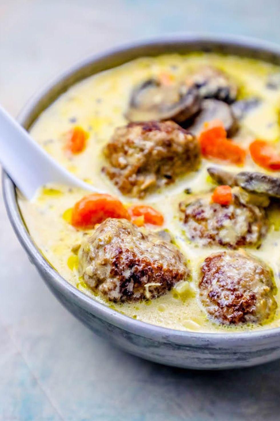 One-Pot Creamy Meatball Soup Pork and sausage meatballs swim in a tasty broth of mushrooms, heavy cream, and a pile of parmesan cheese. Get the recipe from Sweet Cs . Per serving: 971 calories, 82 g fat (39 g saturated), 5 g carbs, 1 g sugar, 542 mg sodium, 49 g protein. Sweet C's