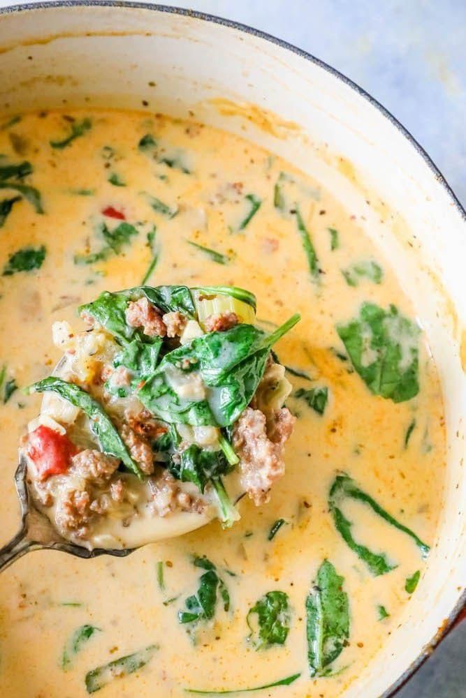 Creamy Tuscan Soup Love the soups at Olive Garden? This copycat recipe has got you covered. Get the recipe from Sweet C's Designs . Per serving: 534 calories, 23 g saturated fat, 9 g carbs, 1 g fiber, 17 g protein Sweet C's Designs