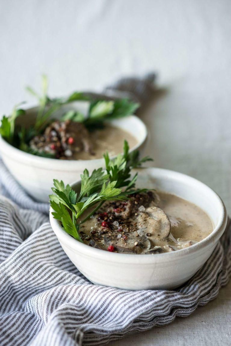 Beef Stroganoff Soup Beef stroganoff is usually served over noodles, but who needs em when you can grab your slow cooker, toss mushrooms and pan-seared sirloin in with beef stock and cream, and enjoy an amazing soup instead? Get the recipe from Peace, Love, and Low Carb . Per serving: 300 calories, 19 g fat, 4.5 g carbs, 20 g protein Peace, Love, and Low Carb