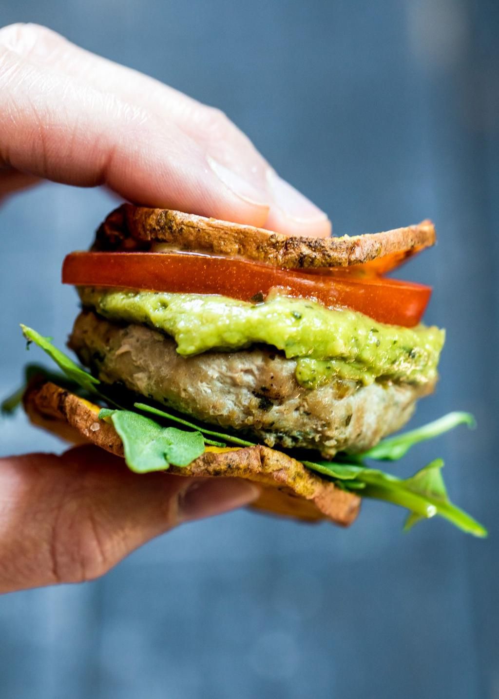 Pesto Turkey Burger Sliders on Sweet Potato Buns These turkey burger sliders from Ambitious Kitchen should be your new go-to appetizer for holiday festivities and tailgates. They look pretty gourmet, and theyre low in carbs and perfectly paleo. That creamy delicious paleo pesto on top just rounds it all out. Ambitious Kitchen