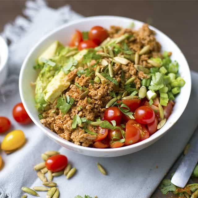 Ground Turkey Taco Bowls With Cauliflower Spanish Rice Toss this ground turkey over a bed of low-carb rice and lettuce for an easy, delicious paleo meal from Wholesomelicious . Use spices like cumin, paprika, garlic, and oregano for that savory kick. Wholesomelicious