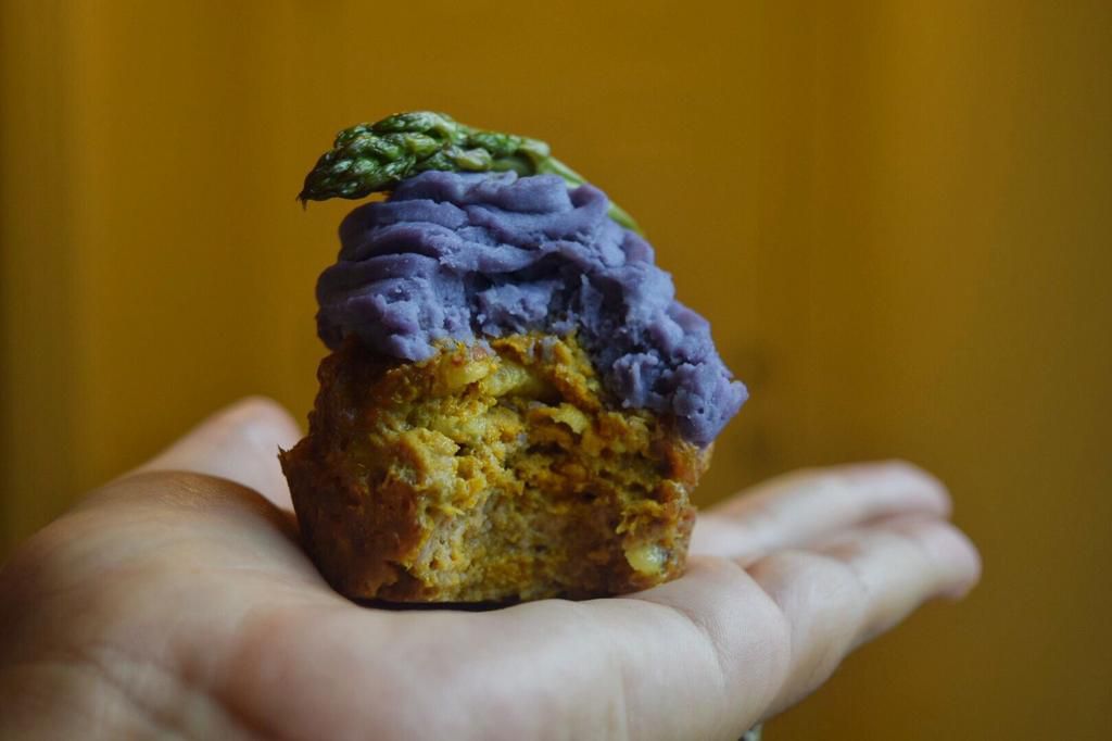 Turkey Sweet Potato Cupcakes Savory cupcakes? With strange purple frosting? Seems weird, but its awesome. This cupcake dish from The Castaway Kitchen uses ground turkey and sweet potato in a fun, bite-sized portable format for easy munching on the go. The Castaway Kitchen