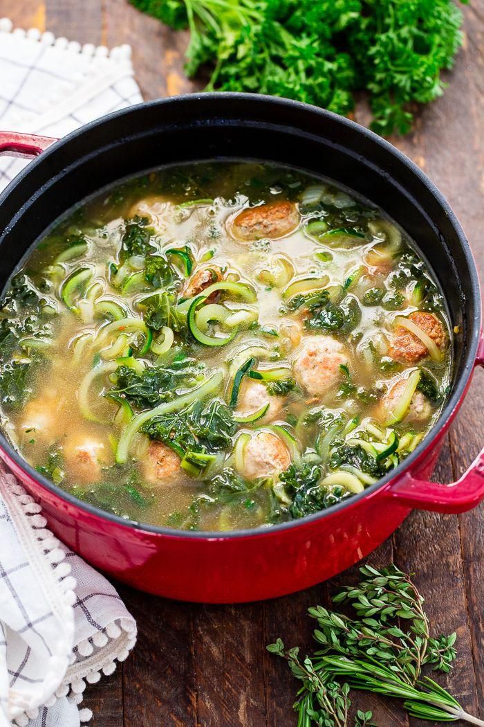 Paleo Turkey Meatball Zoodle Soup This broth-based soup from Paleo Running Momma is loaded with protein and fiber from zucchini and ground turkey, and its a great low-carb, low-sugar meal for when you need something healthy but with enough nourishment to fill you up for hours. You wont miss pasta noodles one bit. Paleo Running Momma