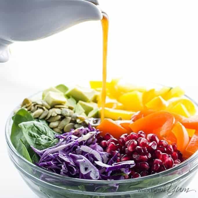 Rainbow salad with pomegranate vinaigrette You can literally taste the rainbow when you eat this colorful and delicious salad for lunch. Per serving: 138 calories, 12 g fat, 7 g carbs, 3 g fiber, 3 g protein Get the recipe Maya Krampf, author of 'The Wholesome Yum Easy Keto Cookbook'