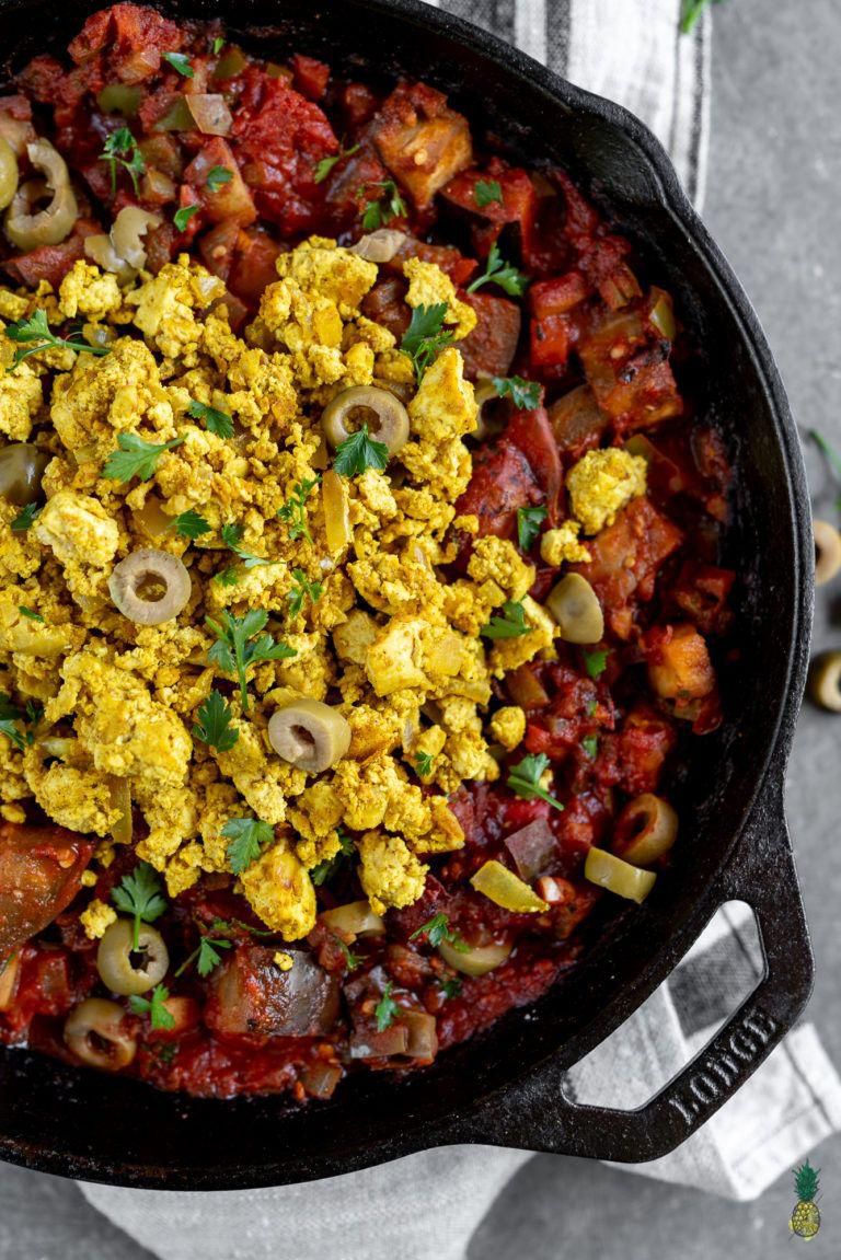 Vegan eggplant shakshuka This Middle Eastern dish basically has it all: It can be eaten for breakfast, lunch, or dinner, is packed with veggies and a filling tofu scramble, and can be prepared in just 30 minutes. Per serving: 155 calories, 7.8 g fat, 15.7 g carbs, 5.3 g protein Get the recipe Sweet Simple Vegan