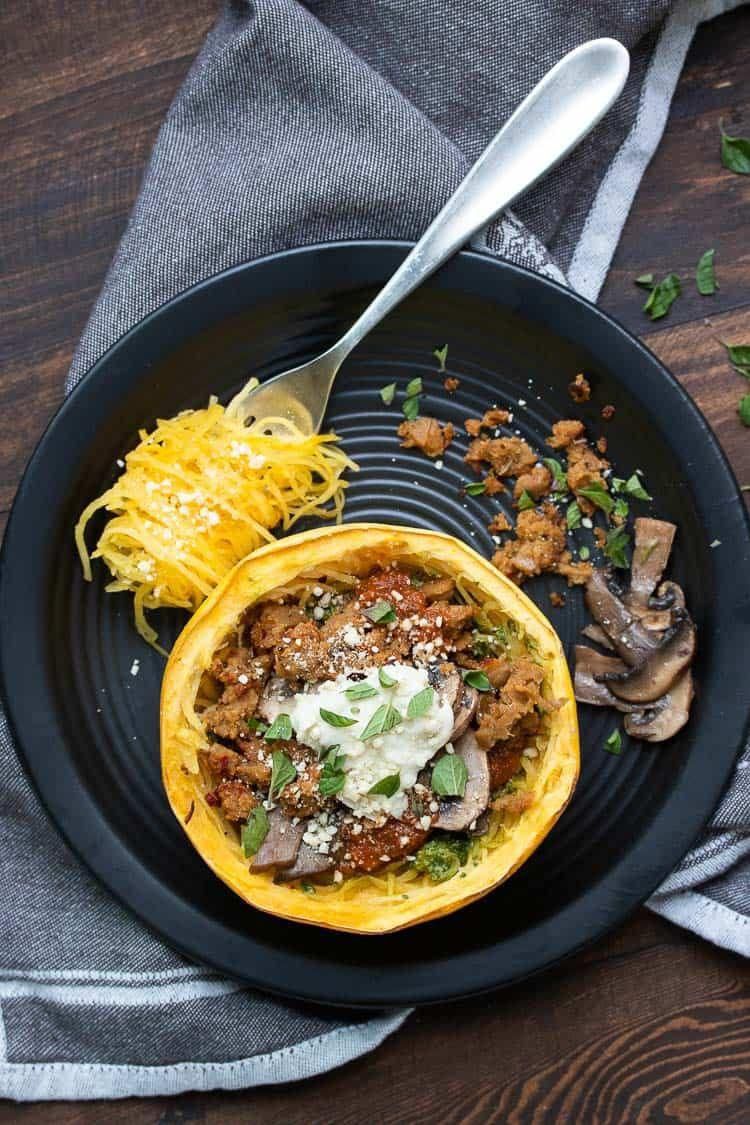 Spaghetti squash bowls Who doesnt love eating dinner from a bowl made out of food? These spaghetti squash bowls pack a real punch with vegan sausage, mushrooms, and broccoli spinach pesto. Per serving: 515 calories, 25 g fat, 57 g carbs, 12 g fiber, 15 g protein Get the recipe Veggies Don't Bite
