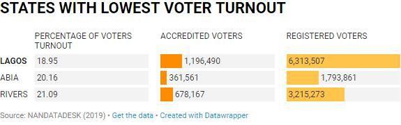 Meanwhile, Lagos State led the states with the lowest voter turnout of 17.25 per cent (1,089,567), followed by Abia with 18 per cent or 323,291 votes and Rivers with 19.97 per cent (642,165) valid voters.
