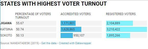 Although Kano State had the highest number of votes cast 1,964,751 and 1,891,134 valid votes, Jigawa had the highest rate of voter turnout with 55.67 per cent (1,171,801) of its registered voters showing up for accreditation.