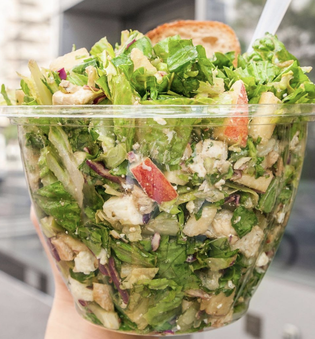 Chopt: Orchard Salad Another eatery making quick, healthy food easier to find across the East coast: CHOPT. Appel loves their Orchard Salad, which is made with crunchy apples, walnuts, and goat cheese. Per serving : 600 calories, 37 g fat (3 g saturated), 21 g carbs, 9 g sugar, 557 mg sodium, 8 g fiber, 44 g protein CHOPT via Instagram