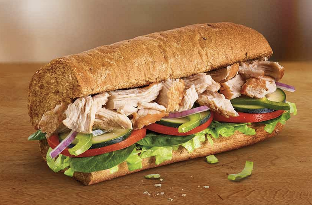 Subway: Rotisserie-Style Chicken Sandwich Sometimes you just need a huge-ass sandwich, right? Subway's Fresh Fit menu makes it easy [to eat healthy], providing two servings of veggies and 24 grams of whole grains per serving, says Rust. To level up her chicken sandwich, Rust opts for nine-grain honey oat bread with banana peppers, lettuce, cucumbers, olives, and spinach. Per serving : 340 calories, 7 g fat (2.5 g saturated), 43 g carbs, 6 g sugar, 900 mg sodium, 5 g fiber, 29 g protein Subway