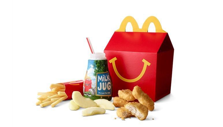 McDonald's: Happy Meal If youre going to a fast food chain like this one, its actually easy to make healthy choices, says Perez. Hit your cravings in moderation with a Happy Meal, which includes four chicken nuggets and a mini serving of fries. Just make sure to avoid fountain soda and stick to water. Per serving : 290 calories, 15 g fat (2 g saturated), 26 g carbs, 0 g sugar, 390 mg sodium, 1 g fiber, 0 g protein McDonald's