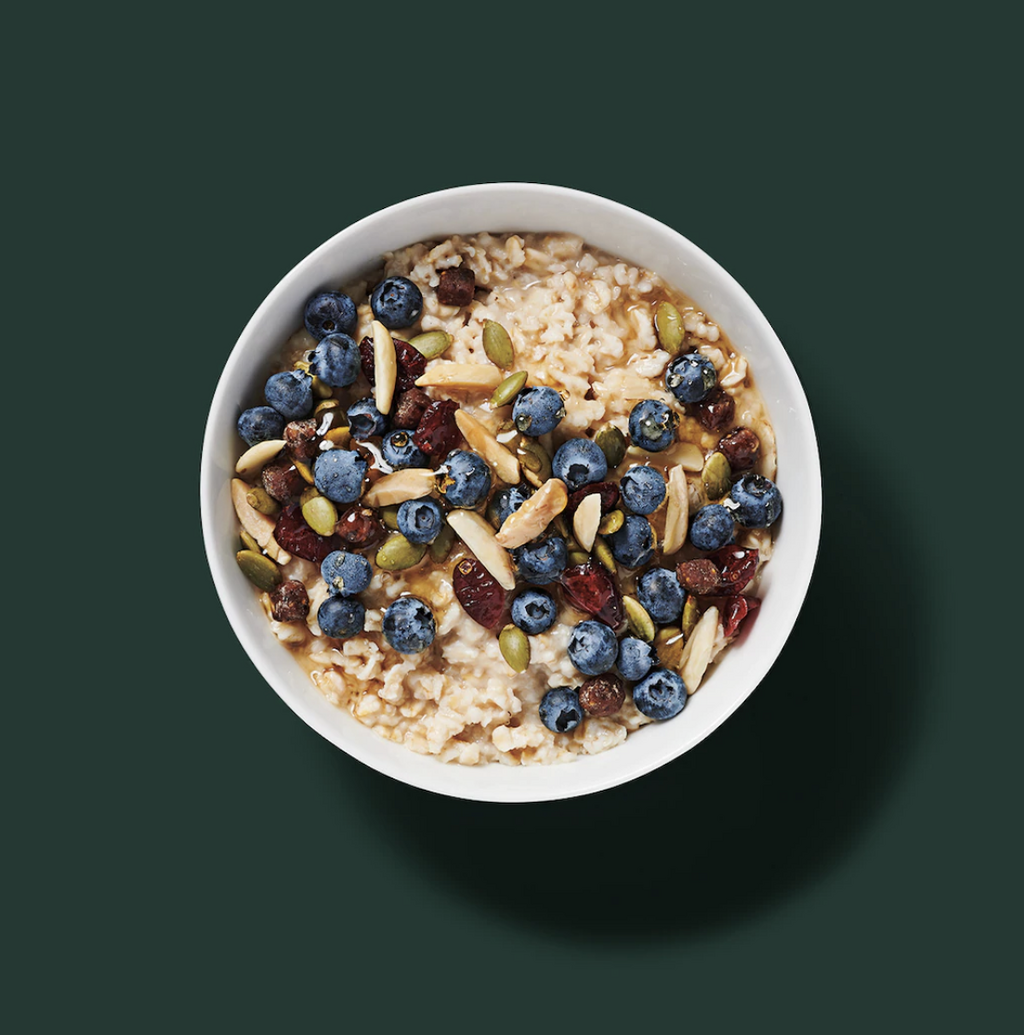Starbucks: Hearty Blueberry Oatmeal Thanks to a substantial selection of ready-to-go meals, Starbucks is a great option when you're pressed for time. "Starbucks has a good selection of breakfast items, says Jessica Ivey , RDN. I love this [oatmeal] because it provides five grams of filling fiber," she adds. Per serving : 220 calories, 2.5 g fat (0.5 g saturated), 43 g carbs, 13 g sugar, 125 mg sodium, 5 g fiber, 5 g protein Starbucks