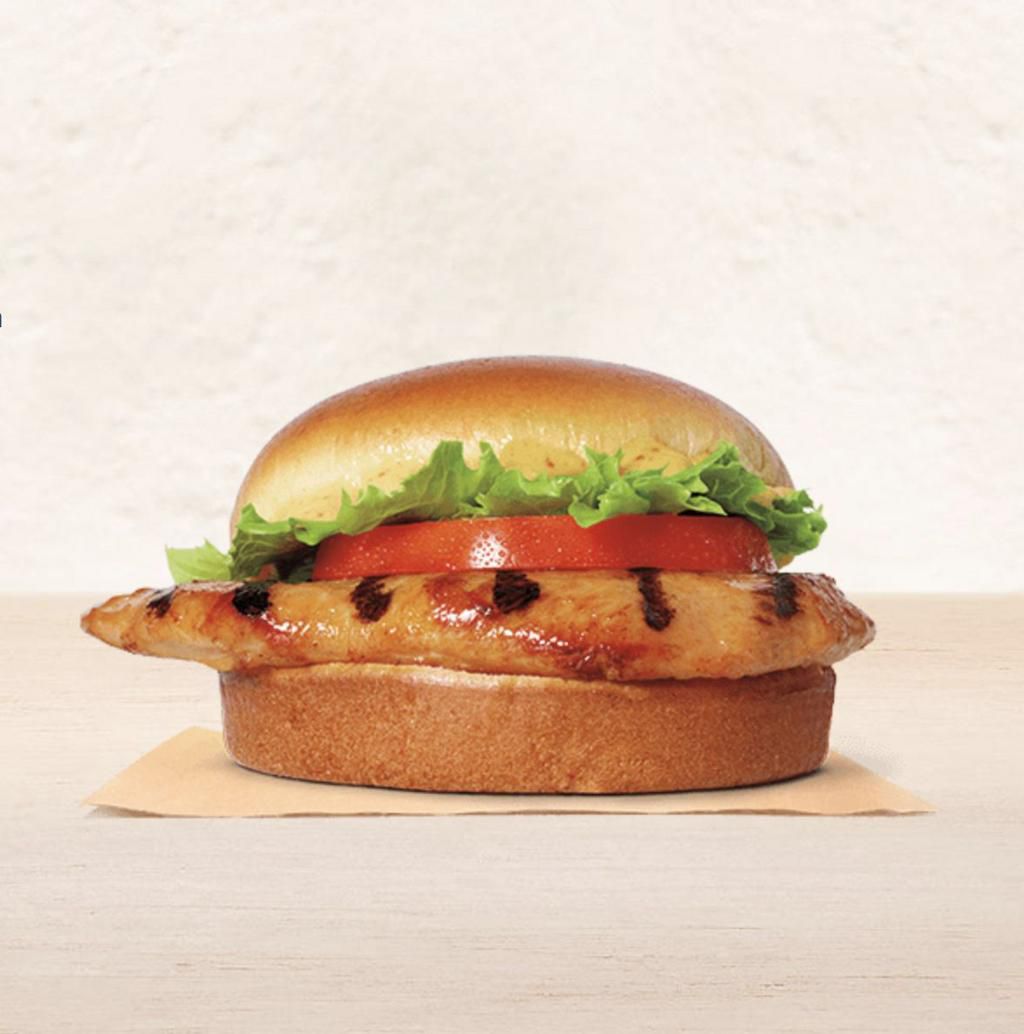 Burger King: Grilled Chicken Sandwich Keep the saturated fat and calories in check while still getting filling protein by choosing the grilled chicken sandwich with a side garden salad, says McGrane. Skip the mayo or sugary honey mustard, and go with ketchup or yellow mustard, instead. Per serving : 430 calories, 11 g fat (2.5 g saturated), 43 g carbs, 11 g sugar, 870 mg sodium, 2 g fiber, 40 g protein Burger King