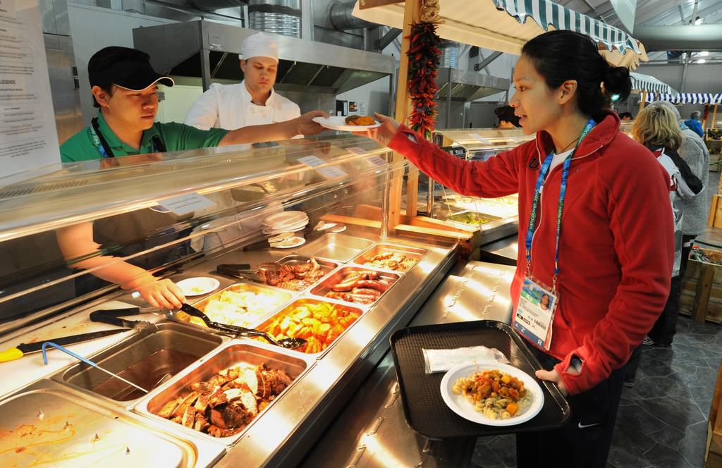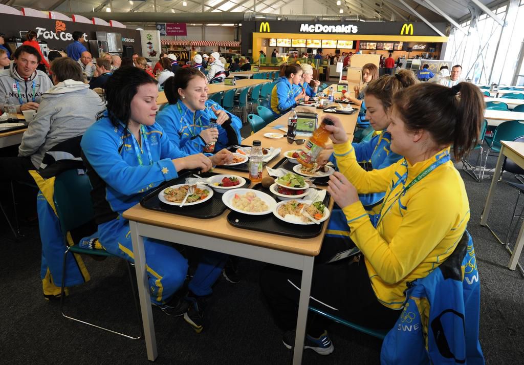 Only one piece of handheld food can be taken from the Olympic Village food court. An apple? Yes. An apple and a to-go tray? Not so much. Only one hand-held item or one beverage can be removed from the Olympic Village food court. MARK RALSTON - Getty Images