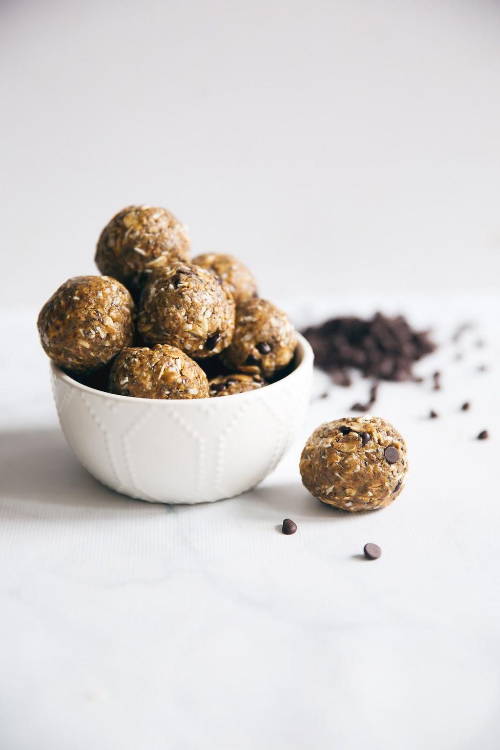 Oatmeal, Chia, Cacao Cookie Energy Bite These contain basically every protein ball add-in, if you're in an everything-but-the-kitchen-sink kinda mood. GET THE RECIPE Per serving: 149 calories, 7.7 g fat, 17.6 g carbs, 8.6 g sugar, 3.9 g fiber, 4.6 g protein Ambitious Kitchen