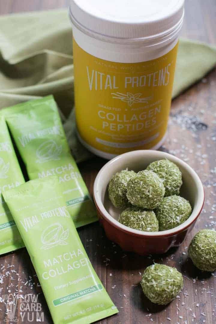 Keto Matcha Protein Balls These are packed with antioxidants and collagen, and they're also just super pretty. GET THE RECIPE Per serving: 116 calories, 9 g fat (4 g sat), 3 g carbs, 1 g sugar, 31 mg sodium, 1 g fiber, 5 g protein Low Carb Yum