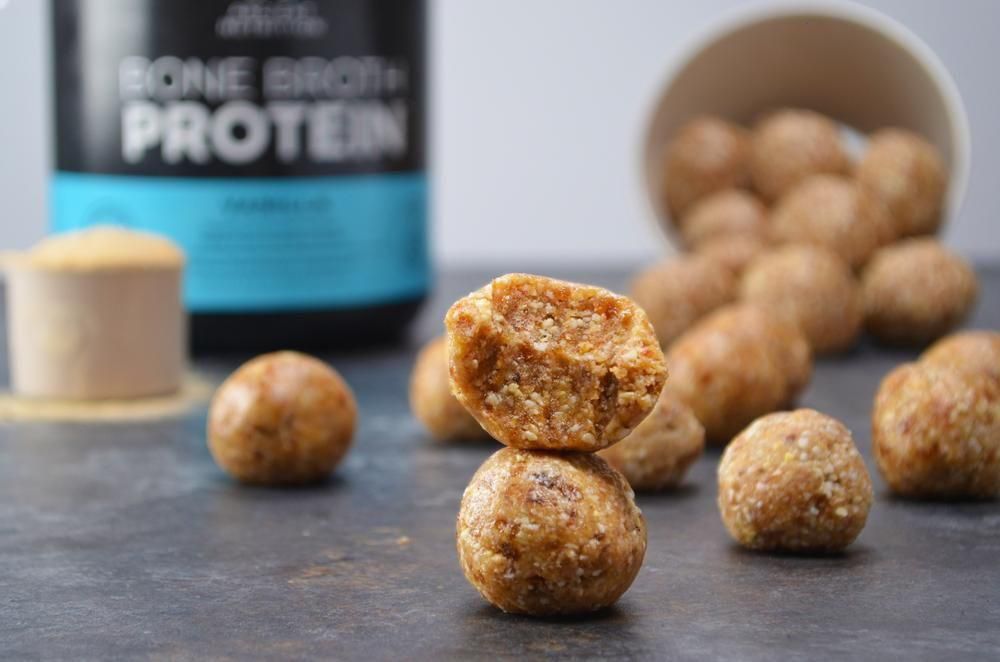 Bone Broth Almond Cacao Energy Balls Don't let the bone broth protein in these freak you out; they're freakin' delicious. GET THE RECIPE Per serving: 338 calories, 24 g fat (6 g sat), 29 g carbs, 4 g fiber, 43 mg sodium, 17 g sugar, 9 g protein Dr. Axe