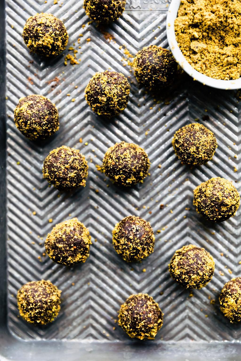 Chocolate Pistachio Protein Balls Pistachios bring unique flavor (and fun color) to these chocolatey bites. GET THE RECIPE Per serving: 85 calories, 6.5 g fat (1 g sat), 5.1 g carbs, 2.1 g fiber, 12 mg sodium, 1.4 g sugar, 3.4 g protein Lindsay Cotter