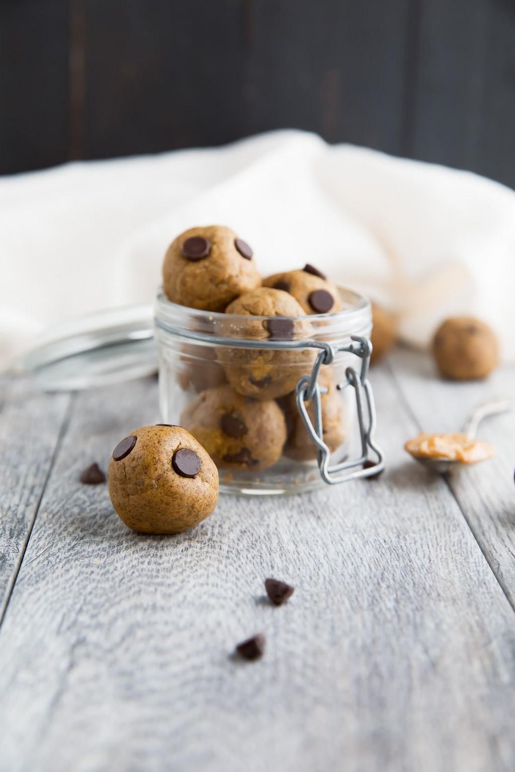 Healthy Peanut Butter Cookie Protein Balls These balls are low-carb, low-sugar, and grain-free, making them an easy option for pretty much anyone, no matter their eating style. GET THE RECIPE Per serving: 135 calories, 9.2 g fat, 5.9 g carbs, 1.7 g fiber, 2.3 g sugar, 5.5 g protein Ambitious Kitchen