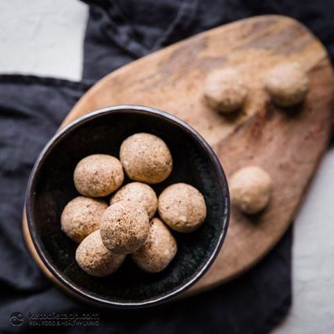 Healthy Keto Almond Protein Balls Made with coconut, almonds, almond butter, and cinnamon, these high-protein bites pack just enough spice. GET THE RECIPE Per serving: 87 calories, 6.3 g fat (0.6 g sat), 3 g carbs, 19 mg sodium, 1.9 g fiber, 6.3 g protein KetoDiet App