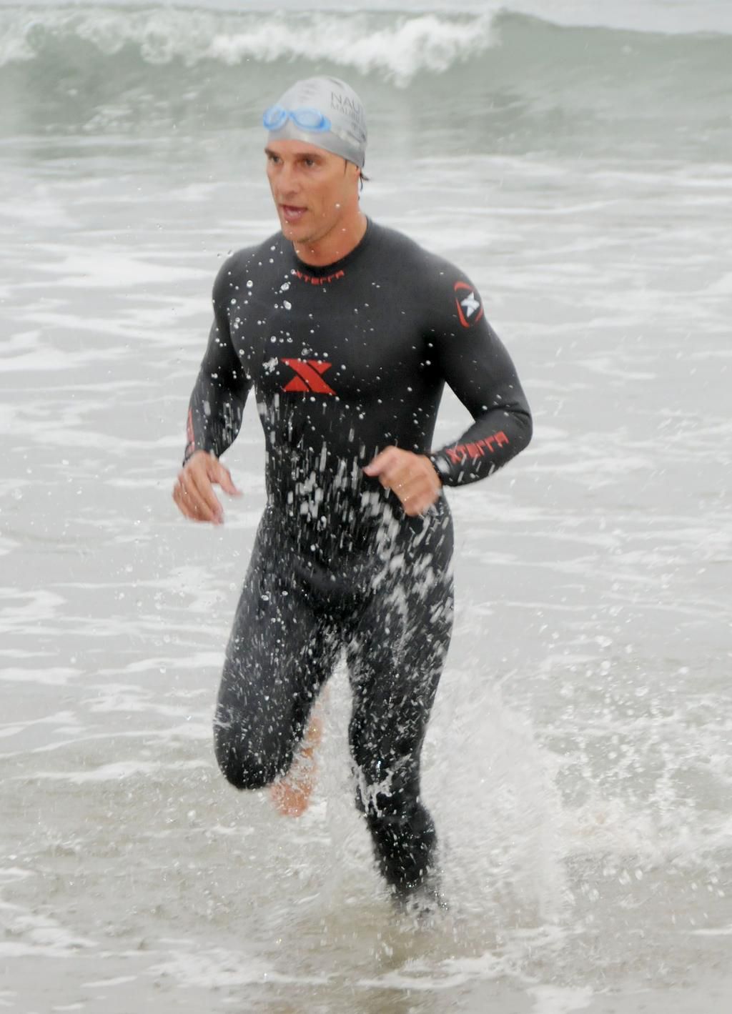Matthew McConaughey There's no doubt that Matthew McConaughey is fit, but did you know he finished the 4-mile run portion of the Nautica Malibu Triathlon in 27:25? That's just slightly under a 7 minute mile pace. His final time was 1:43:48. Alright, alright, alright. Gregg DeGuire - Getty Images
