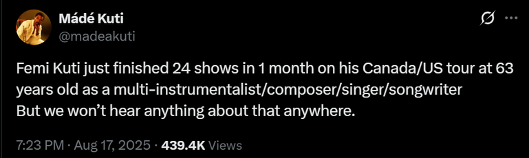 63-year-old Femi Kuti plays in 24 shows in 1 month in his North America tour