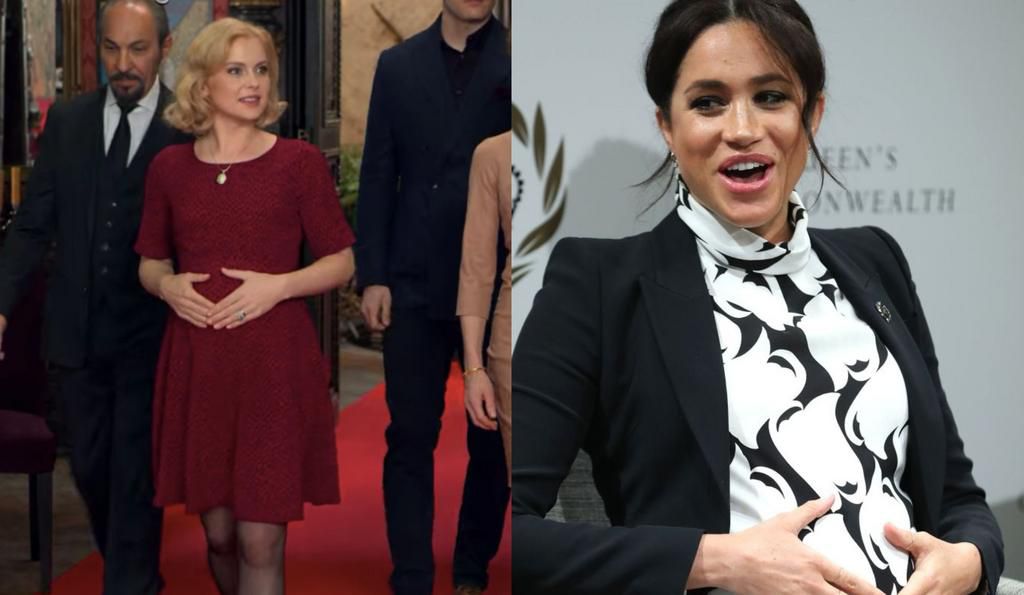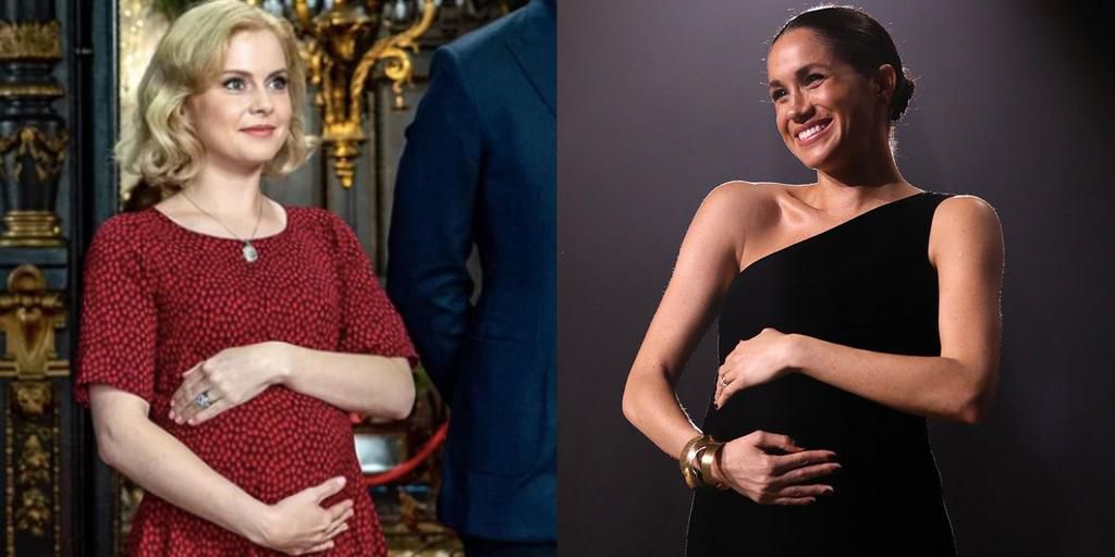 Amber mirrored Meghan's regal baby bump pose. Remember Meghan's speech at Britain's 2018 Fashion Awards ? It's when she famously cradled her baby bump as seen here. And Amber of Aldovia definitely took note because she's mastered the exact same pose. Netflix / Getty Images