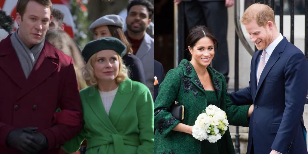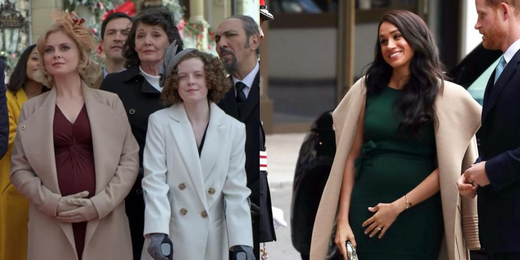 They both wore emerald green. These two royals (both real and fictional) know how to dress the part. Apparently, drab colors are banished from their kingdoms. Here, both pregnant Meghan and pregnant Amber are rocking bold green coats during public outings with their royal hubbies. Netflix / Getty Images
