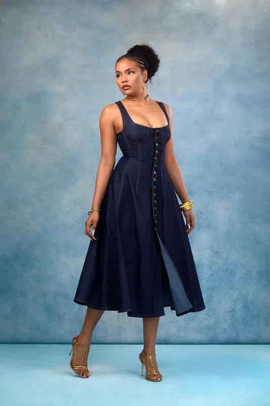 Havana is a vintage-inspired take on modern denim; feminine and easy to wear. This corset-style midi dress is classic, featuring a deep V neckline that frames the figure, contrast topstitching that flatters the outline, and a cinched waist that flows into a flared A-line skirt.