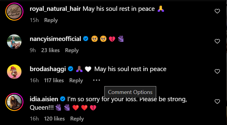 Fellow actress Omoni Oboli commented, "Our thoughts and prayers are with you and your family 🤍 May his soul rest in peace 🙏🏾🤍" Linda Osifo wrote, "So sorry about your loss sis 😢May God comfort your heart.🙏 🕊️"
